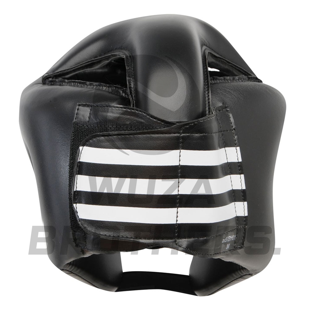 a hook and loop tape fastening to both the back of the head and chin to ensure that this head guard is