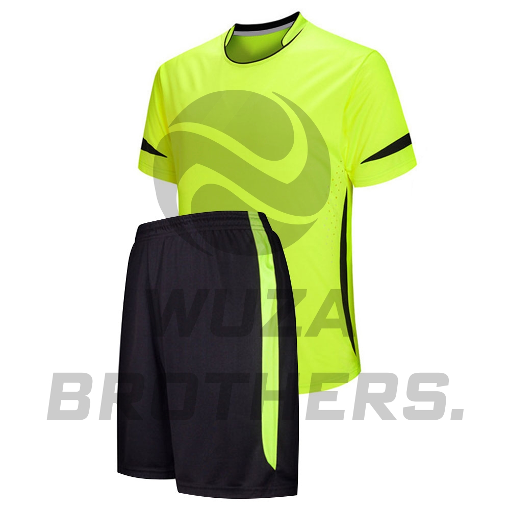 Fully sublimated Soccer Uniform features a solid jersey with offset shoulder, arm cuff and back collar